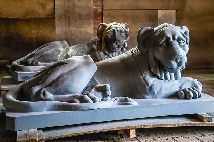 Скульптуры львов из усадьбы Кузьминки в реставрационной мастерской. Источник: mos.ruПродолжаются реставрационные работы в усадьбе Кузьминки в Москве. В течение года приведены в порядок несколько объектов, среди них «Мыльная» (ванный домик), два грота и арочный мост с историческими фонарями и грифонами. Также закончена реставрация кузницы и Львиной пристани на берегу Верхнего Кузьминского пруда — одной из знаковых частей усадебного ансамбля. Ее построили в 1811 году и перестроили в 1830-х, вероятно, по проекту Доменико Жилярди. В 1950-х годах пристань превратилась в руины, а в 2000-х была почти полностью утрачена.