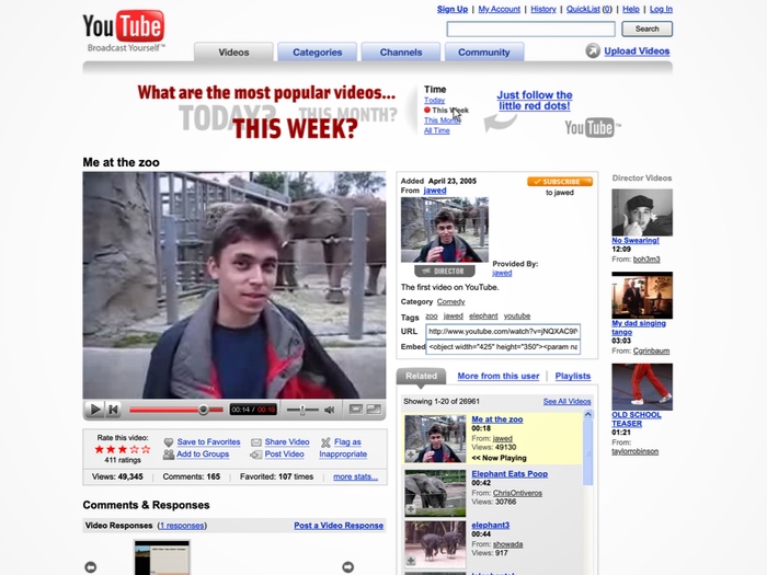 Страница интерфейса YouTube от 8 декабря 2006 года, реконструированная в 2026 году. Источник: the-independent.comЛондонский Музей Виктории и Альберта купил реконструкцию интерфейса YouTube с оригинальным видеоплеером и первым загруженным на платформу видео. Страница сайта, воссозданная в сотрудничестве с командой User Experience YouTube, содержит 19-секундный ролик «Я в зоопарке» (Me at the zoo), загруженный 24 апреля 2005 года сооснователем YouTube Джаведом Каримом.