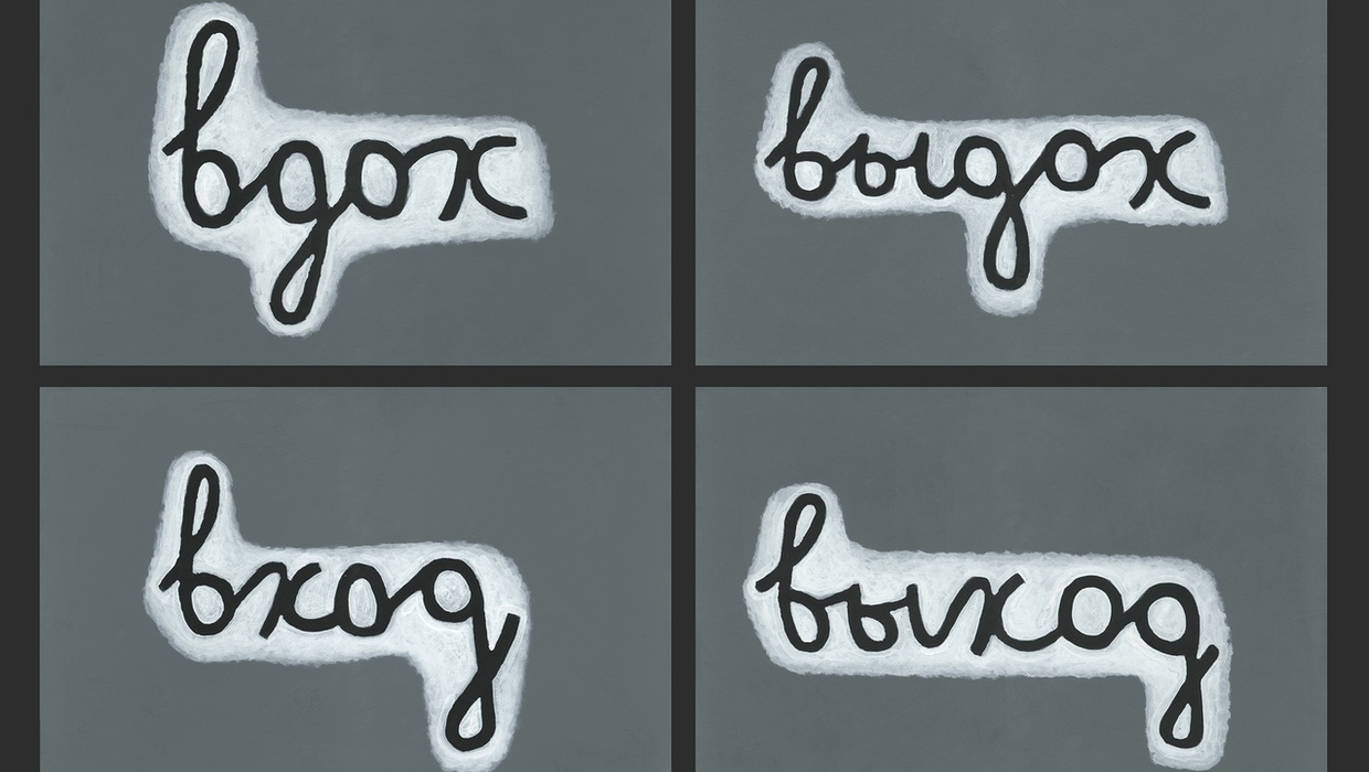 В 2022 году Аня Желудь создает «Стихи»: четыре фанерных листа, на каждом из них написаны гнутые буквы в белом окаймлении. Проволочный шрифт окружен не то инеем, не то медицинской ватой, обволакивающей дребезжащую живопись. Маячит на краю сознания и ассоциация с комиксовыми репликами в облачках: только вот говорящего персонажа у Ани Желудь не видно: похоже, это реплики реальности. «Вдох выдох» «вход выход» «вдох вход» «выдох выход» «вдох выход» «вход выдох»… — перебираем вариации чтения как четки. На каждое слово — один фанерный лист, но читать и вешать их следует вместе, а значит — между ними остаются промежутки.