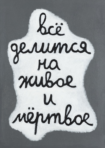 Аня Желудь. Все делится на живое и мертвое (из серии «ПОЛ БЕДЫ, или Иллюзия быта»). 2017. Фанера, темпера, лак. Мультимедиа Арт Музей, Москва